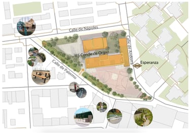 El proyecto tiene como objetivo transformar y mejorar el entorno del IES Conde de Orgaz, tanto desde una perspectiva estética como funcional, para ofrecer un espacio más amable, limpio, seguro, inclusivo y sostenible para el alumnado y el vecindario. La iniciativa contempla la creación de un entorno ajardinado y renaturalizado, con áreas de sombra que actúen como refugios climáticos, recuperando el espacio para sus habitantes. Además, se busca que este lugar se convierta en un punto de encuentro y ocio, ideal para que los estudiantes lo disfruten durante los recreos o al salir del instituto, fomentando así una mayor conexión entre la comunidad educativa y el entorno urbano.