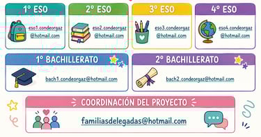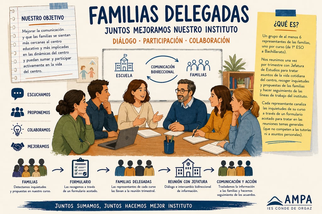 Un grupo de al menos 6 representantes de las madres y padres - una por curso- en el que estarán representados todos los niveles educativos, desde la ESO hasta Bachillerato. En estas reuniones, una por trimestre se abordarán asuntos de la vida cotidiana del centro: desde las formaciones y líneas de trabajo que se están llevando a cabo en las aulas, hasta las propuestas, inquietudes y preocupaciones generales de las familias.